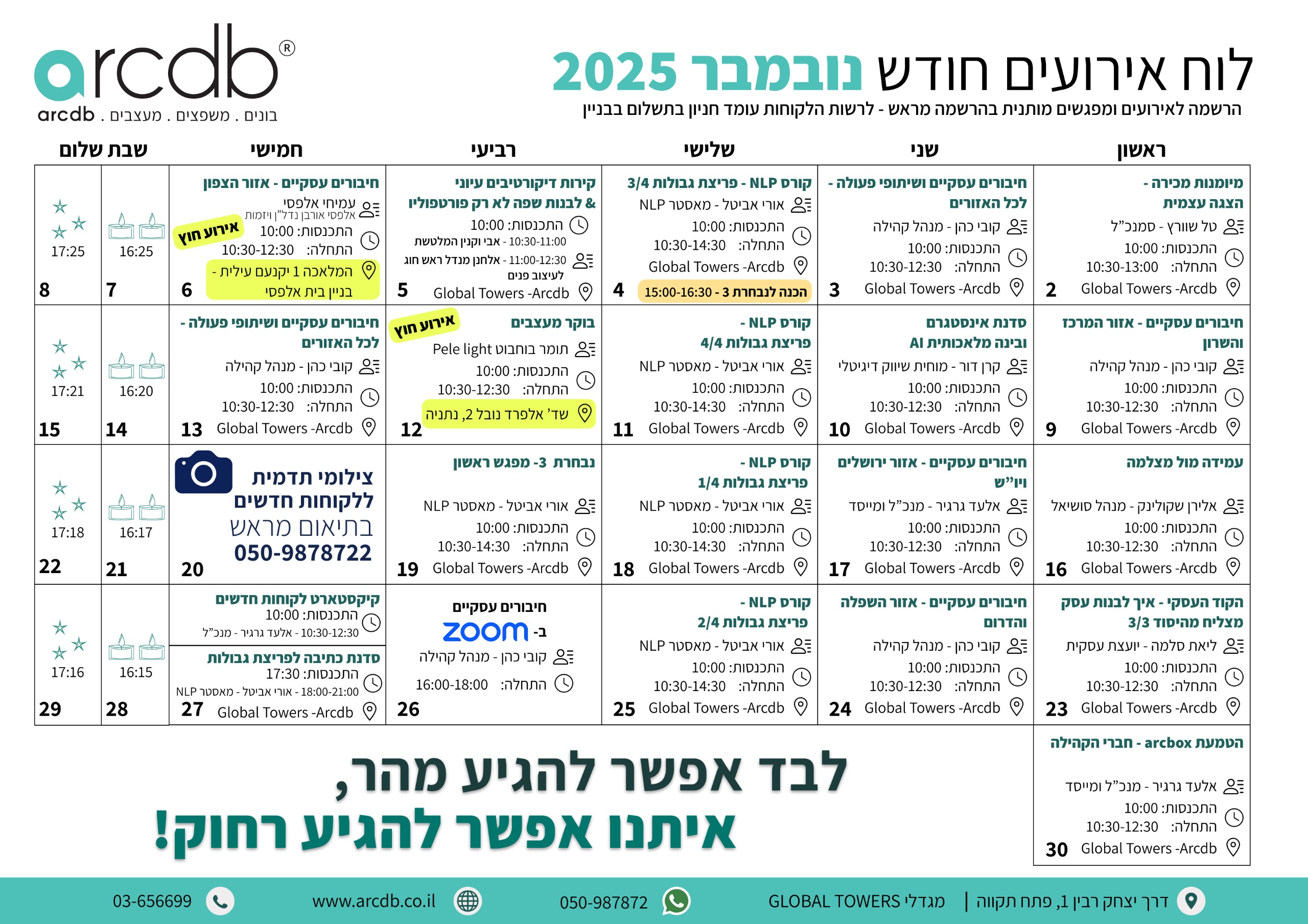 השתתפות באירועים וכנסים, סדנאות מקצועיות, שיתופי פעולה עם הקהילה ומפגשים עסקיים משני מציאות בכל מפגש תכירו אנשים חדשים ותייצרו הזדמנויות עסקיות חדשות עם בעלי מקצוע איכותיים.
