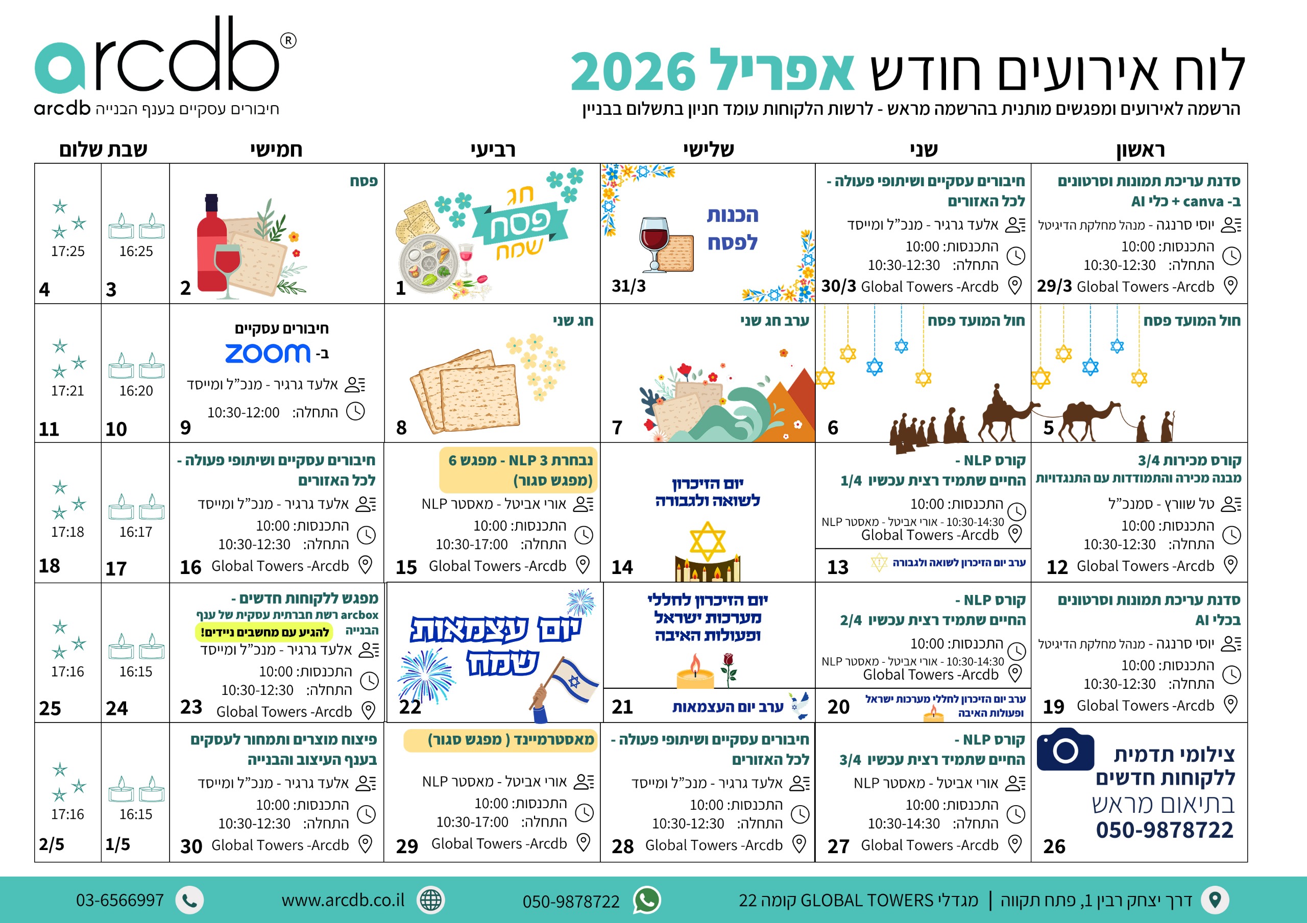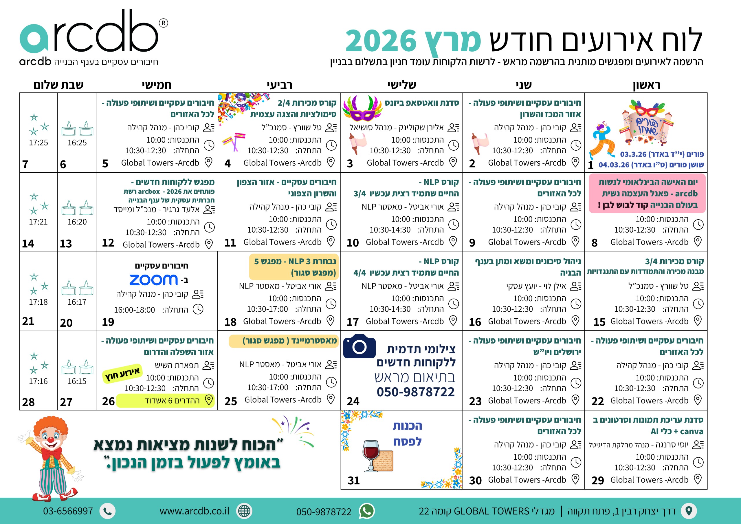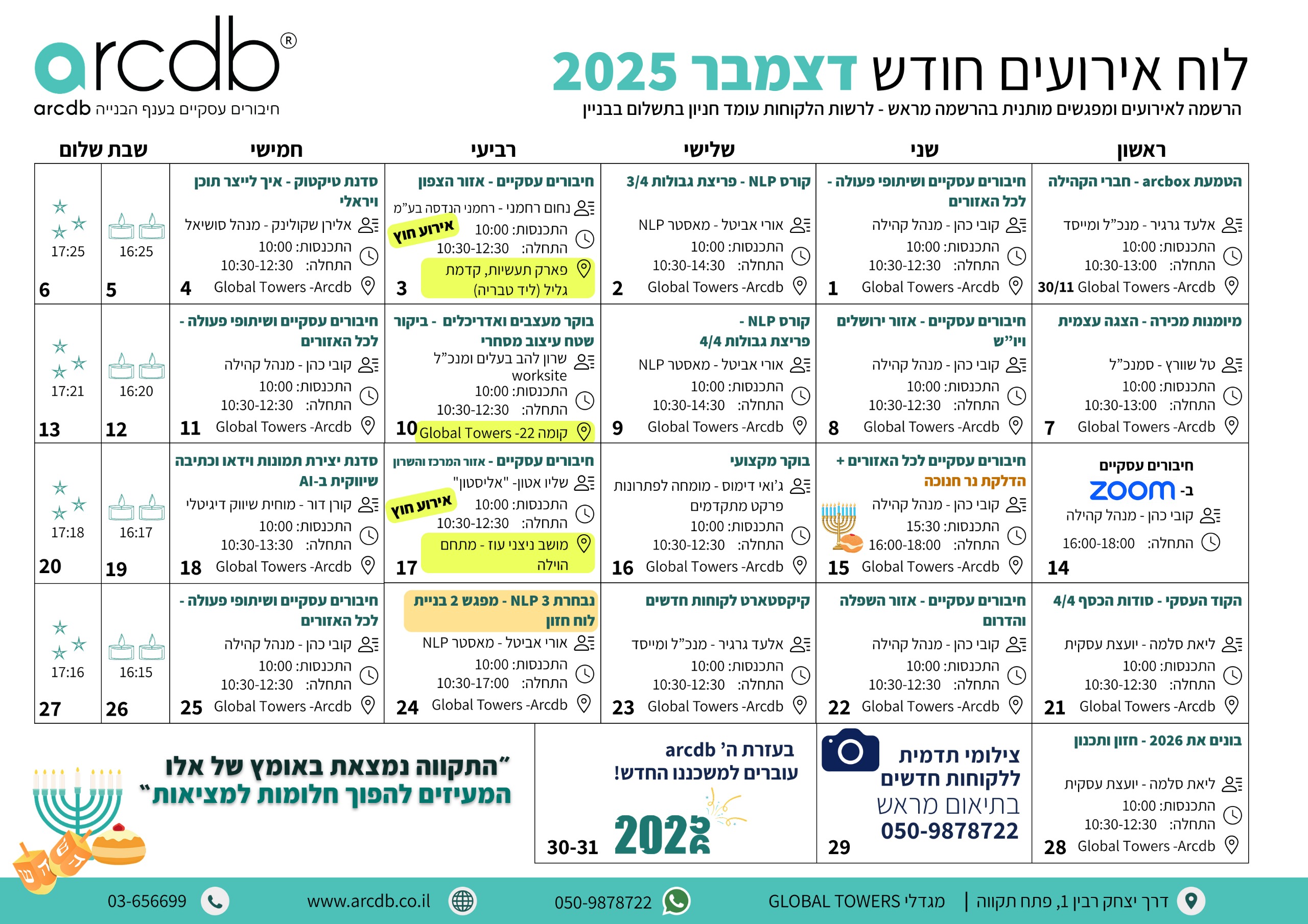 השתתפות באירועים וכנסים, סדנאות מקצועיות, שיתופי פעולה עם הקהילה ומפגשים עסקיים משני מציאות בכל מפגש תכירו אנשים חדשים ותייצרו הזדמנויות עסקיות חדשות עם בעלי מקצוע איכותיים. אצלנו תקבלו את כל הכלים לניהול חכם של העסק: סדנאות בנושא תמחור אישי, שיווק ומכירות, כתבי כמויות , איך מנהלים את המדיות החברתיות הכי נכון שיש, ליווי אישי ועסקי מבלי להוציא כסף מיותר!