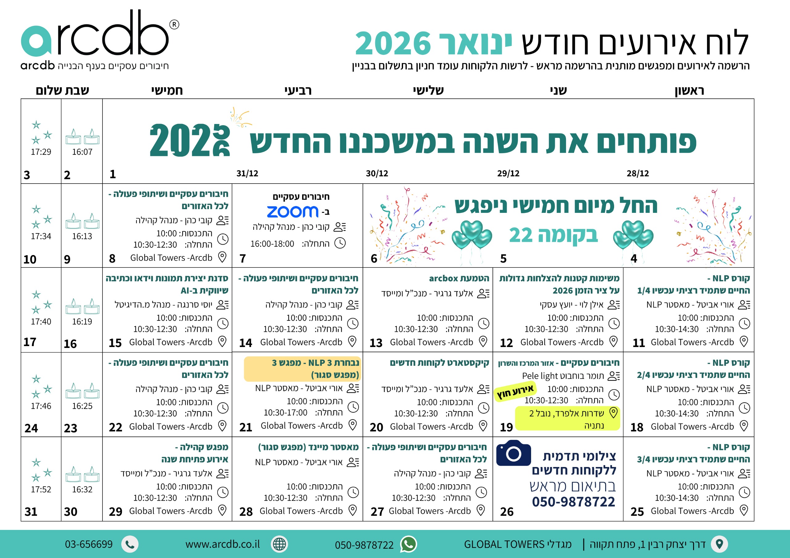 השתתפות באירועים וכנסים, סדנאות מקצועיות, שיתופי פעולה עם הקהילה ומפגשים עסקיים משני מציאות בכל מפגש תכירו אנשים חדשים ותייצרו הזדמנויות עסקיות חדשות עם בעלי מקצוע איכותיים.